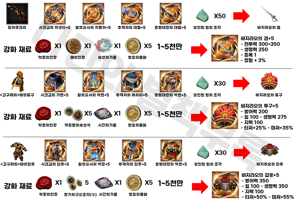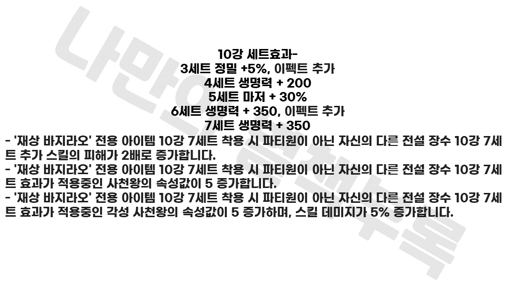 - 전설 장수 전용 아이템 5강 3세트와 10강 3세트를 동시에 착용할 경우, 패시브 증가 효과는 10강 3세트 효과만 적용됩니다.