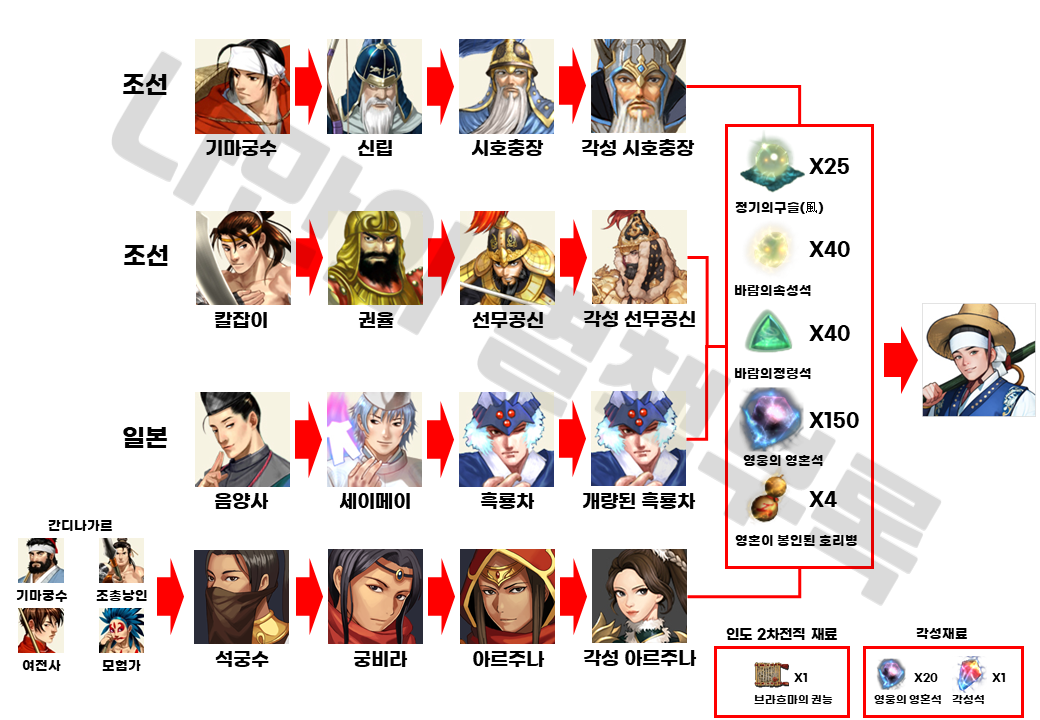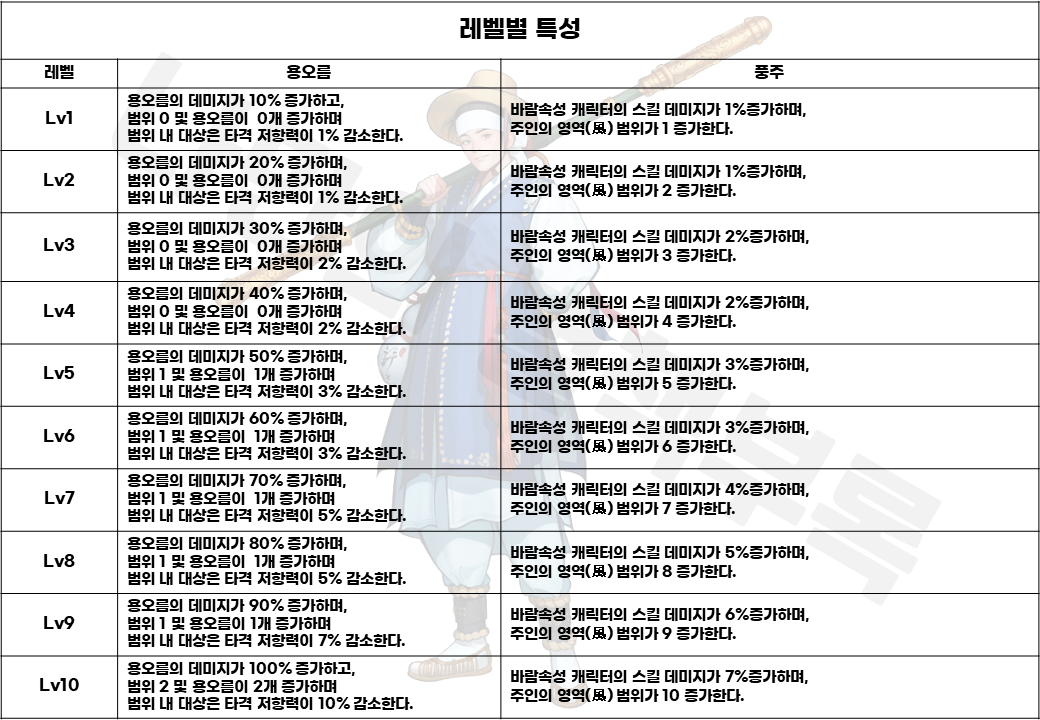- ‘용오름’ 스킬의 타격저항 감소 효과는 장수 및 각성장수와 중첩으로 사용할 수 없으며 먼저 적용된 스킬의 효과가 우선 적용됩니다. (각아르주나, 각아즈미 등의 타저 감소 효과와 중첩 불가)