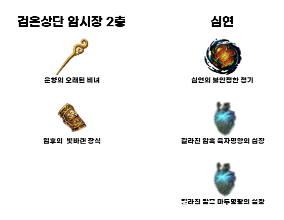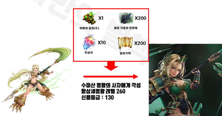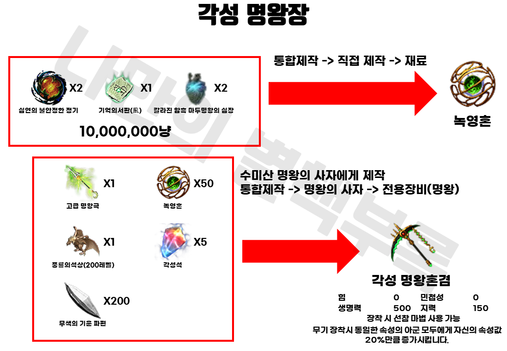 - 각성 명왕은 공통적으로 '악몽' 스킬을 가지고 있으며 7등급 이상의 몬스터와 전투 시 확률적으로 '검은 기운의 결정체', '악몽의 결정체' 아이템을 획득할 수 있습니다.