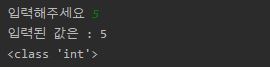 input() int(input())으로 입력을 받게 되면 자료형이 int로 변경된 걸 볼 수 있습니다.