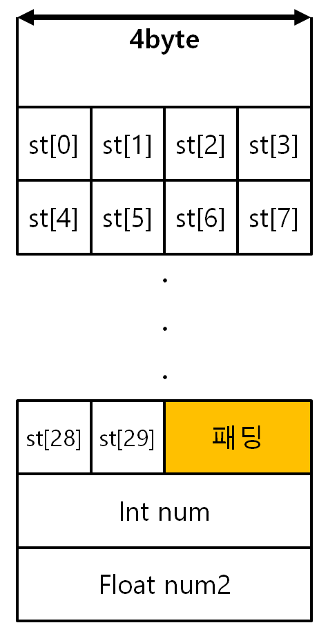 int num;이 4byte로 가장 크기 때문에 4byte 기준으로 정렬을 하면 char st[30];가 2byte만큼 사용하지 않는 공간이 발생하는데 여길 채워주는 값을 패딩이라고 합니다. 그래서 구조체나 공용체는 sizeof()를 사용했을 때 크기가 더 크게 표시되는 경우가 있습니다.