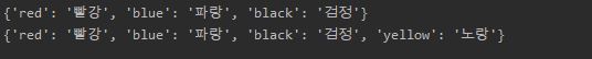 color = {'red': '빨강', 'blue': '파랑', 'black': '검정'}