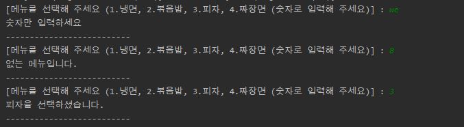 order = input("[메뉴를 선택해 주세요 (1.냉면, 2.볶음밥, 3.피자, 4.짜장면 (숫자로 입력해 주세요)] : ")