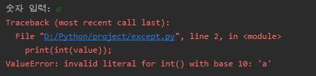 위의 에러 내역을 보면 ValueError라는 예외가 발생했습니다. 실행해야 할 데이터가 잘못되면 발생합니다.