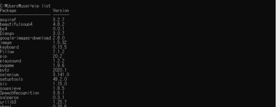 pip list를 입력하면 현재 설치된 패키치와 현재 설치된 패키지의 버전이 모두 나옵니다.