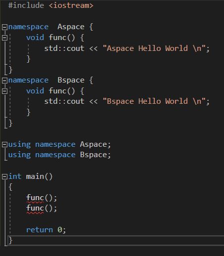 네임스페이스 Aspace와 Bspace에 각각 같은이름의 함수 func를 정의했습니다.