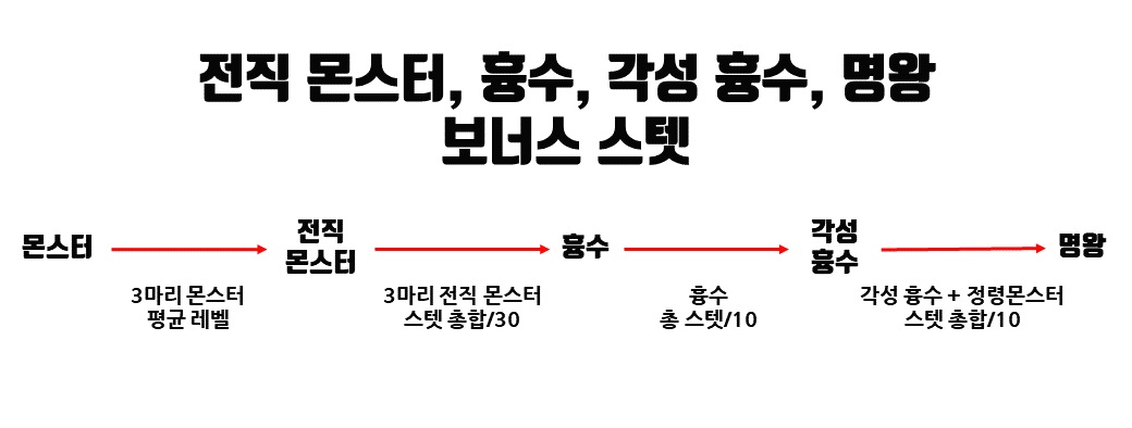 전직몬스터이하를 전부 평균 1레벨로 해도 최대 보너스 스텟과 12밖에 차이가 나지 않습니다.