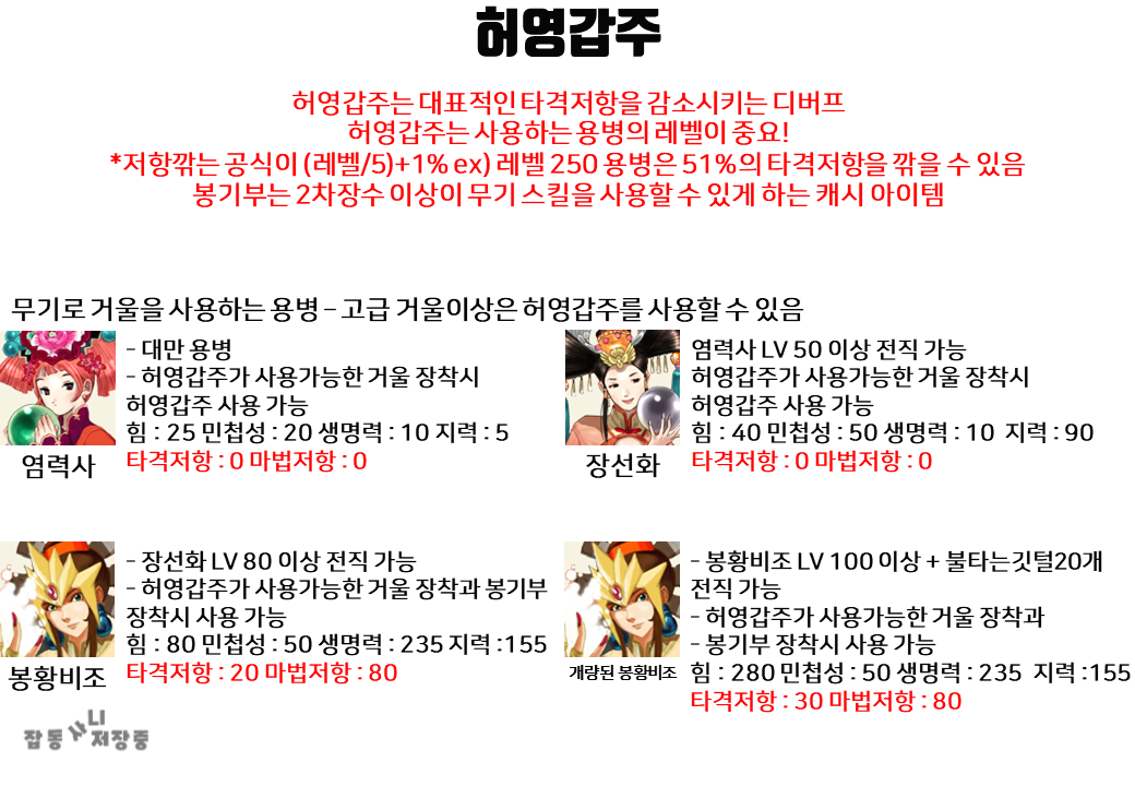 강 허영갑주는 250 기준으로 61%의 타격저항을 감소시킵니다.(차후 추가 예정)