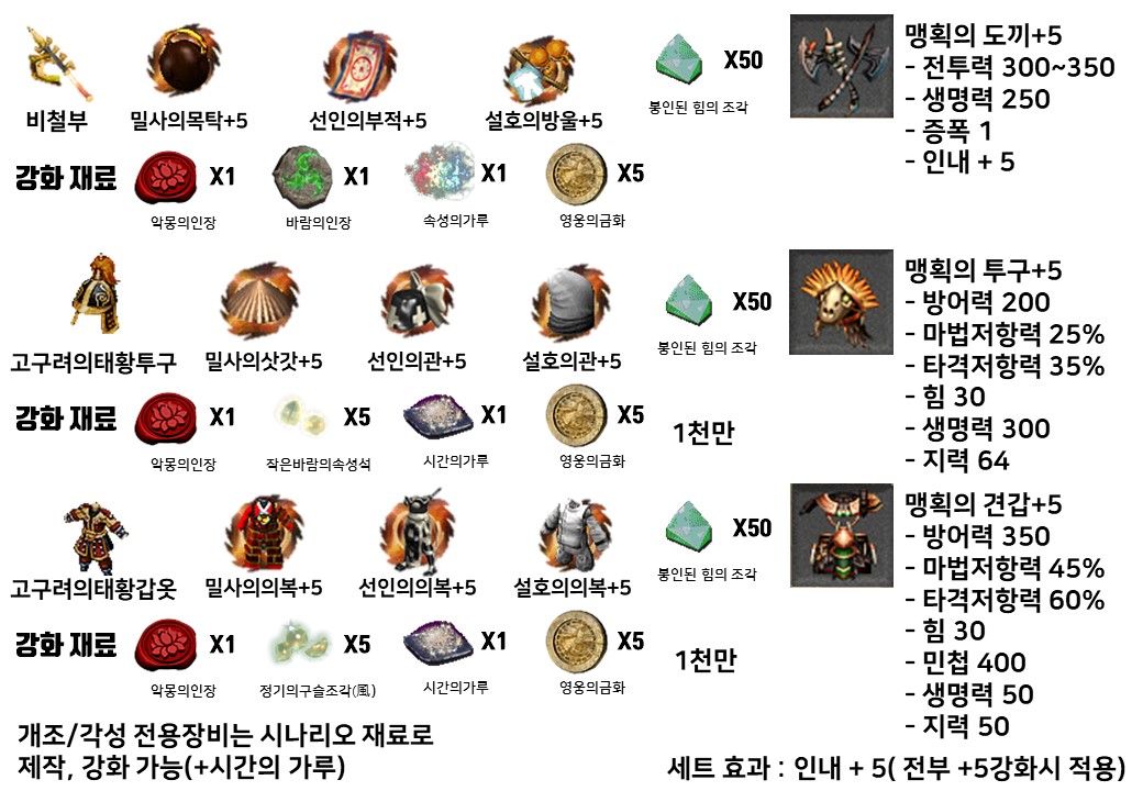 전용 장비의 재료는 전설장수에 들어가는 재료장수들의 전용장비 + 재료들입니다.