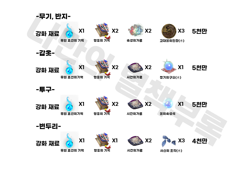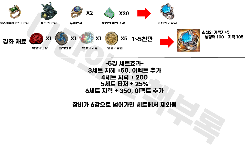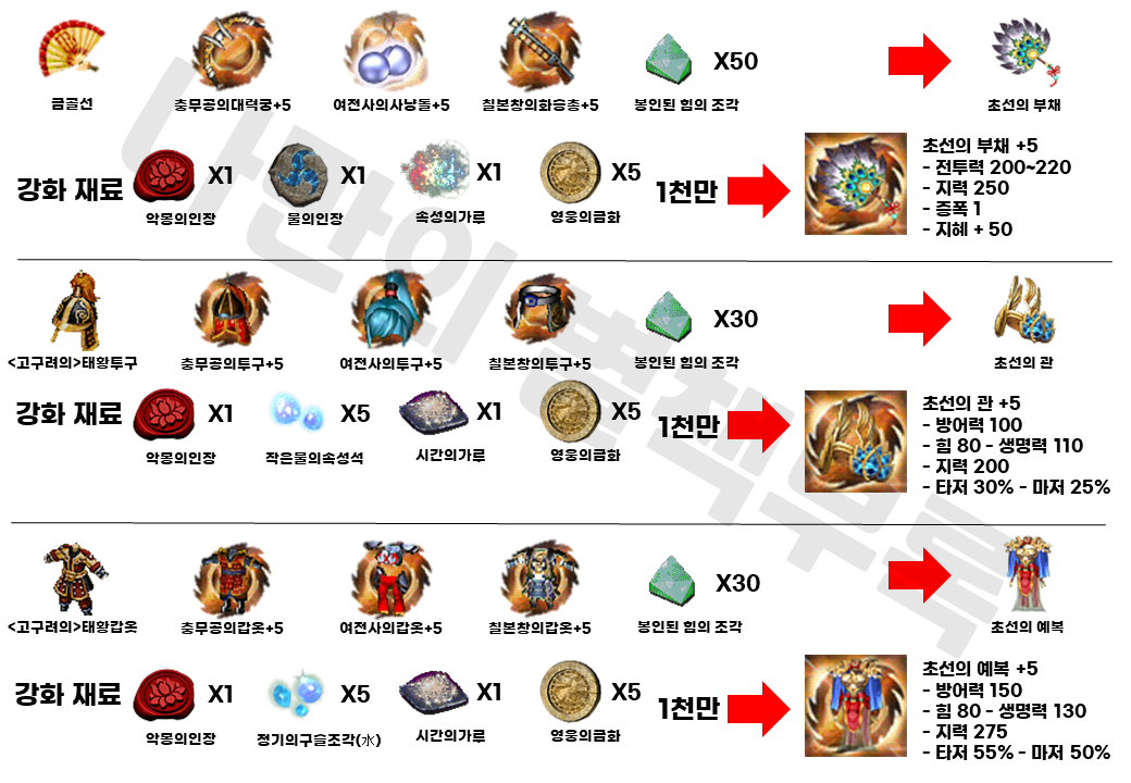 - 전설 장수 전용 아이템 5강 3세트와 10강 3세트를 동시에 착용할 경우, 패시브 증가 효과는 10강 3세트 효과만 적용됩니다.