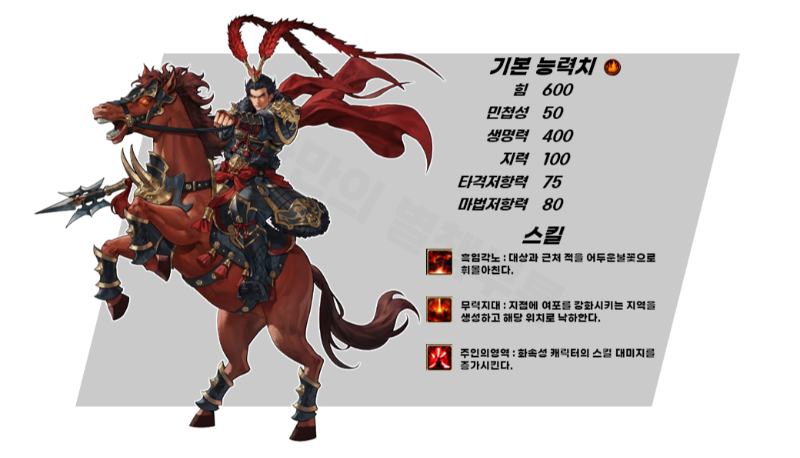 적의 진형에 떨어져 탱커역할을 수행하며 지국천왕과 같이 사용하면 대미지 상승효과가 있는 장수입니다.
