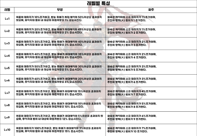 - '무력지대' 스킬의 마법저항 감소 효과는 장수 및 각성장수와 중첩으로 사용할 수 없으며 먼저 적용된 스킬의 효과가 우선 적용됩니다. (각쎄스, 각난다의 마저 감소 효과와 중첩 불가)